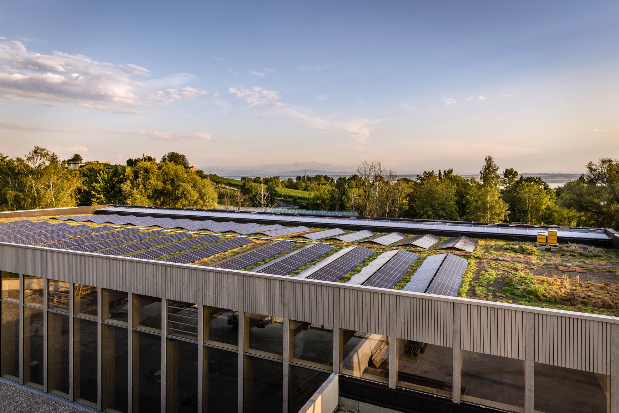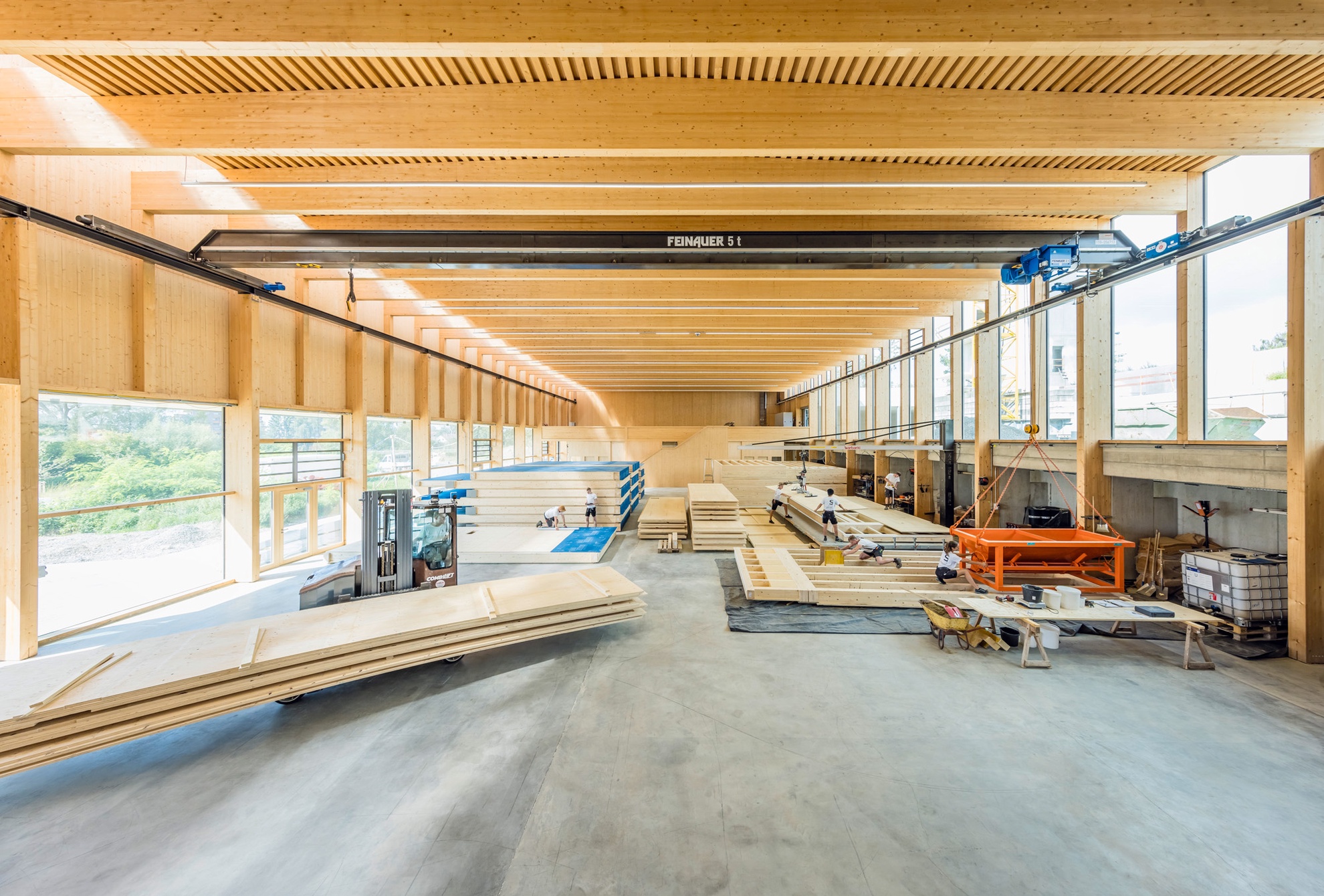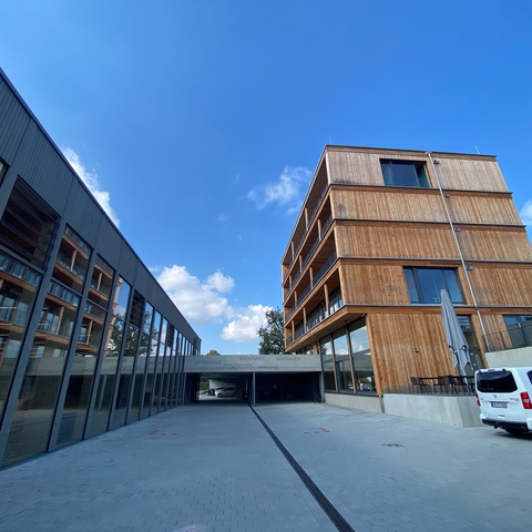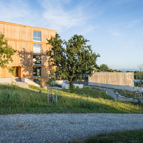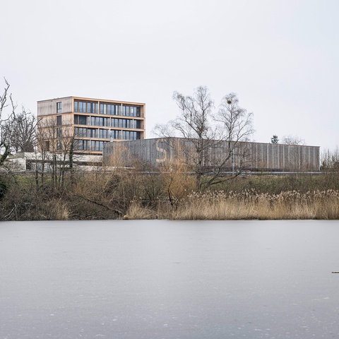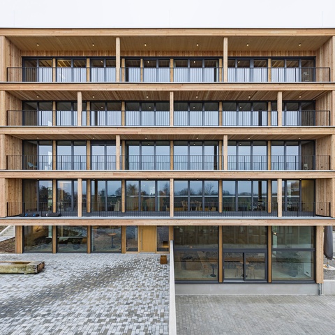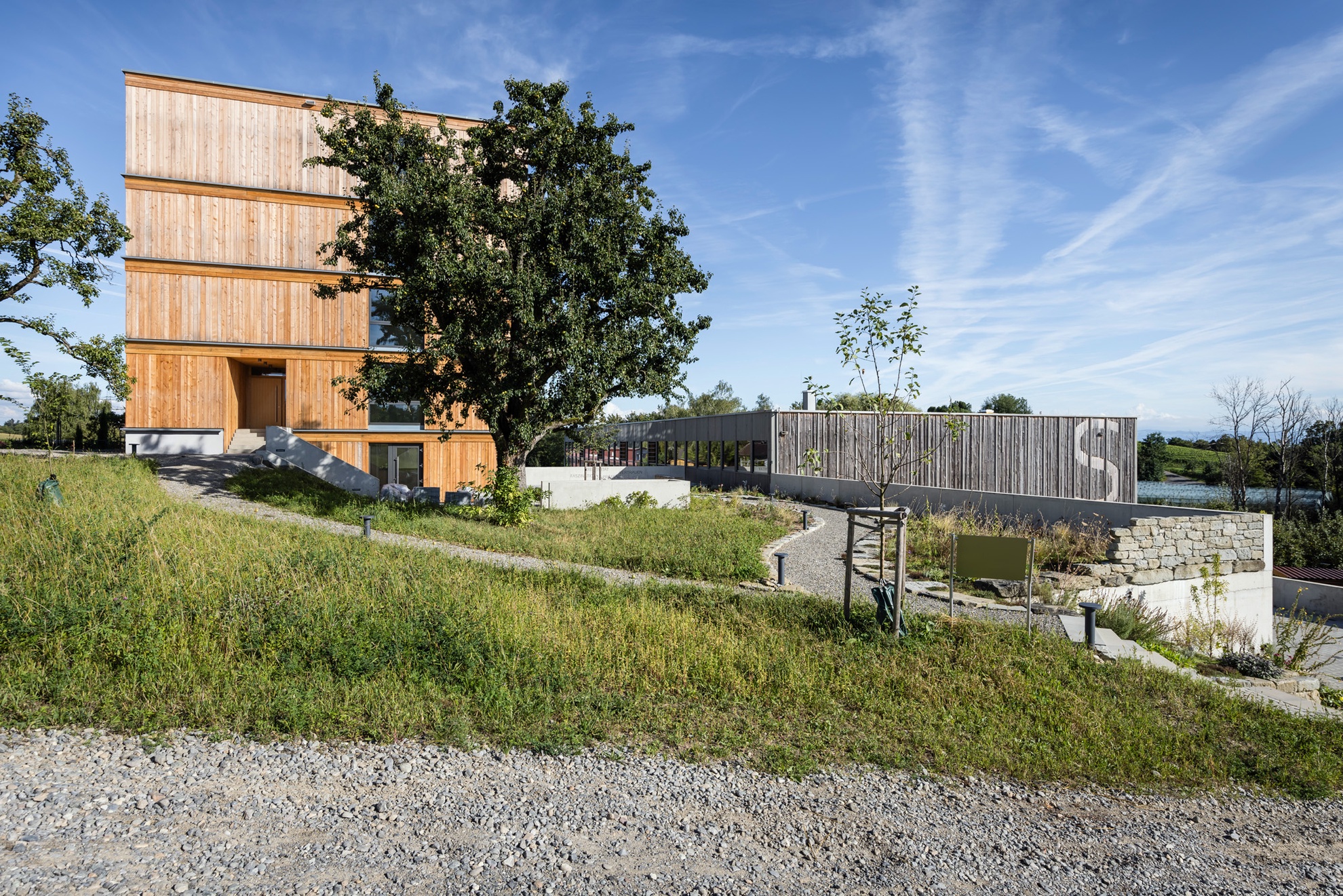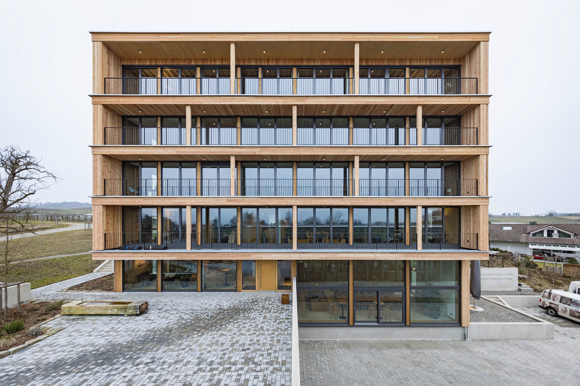 Der Holzbaubetrieb Schmäh verlegte seinen Standort vom Meersburger Zentrum in ein Gewerbegebiet. Dort errichtete er ein KfW-40-Plus-Ensemble in Holzskelettbauweise, bestehend aus einer Produktionshalle und einem sechsgeschossigem Verwaltungs- und Wohngebäude mit zehn Mitarbeiterwohnungen. Im Fokus des Bauvorhabens standen effiziente und robuste Holzbauprozesse, Ressourcenschonung sowie kreislauffähige Konstruktionen ohne Verbundstoffe. Die Neubauten nutzen daher flexibel ausbaubare Tragwerke, regionale Holzarten und recycelte bzw. Abfallmaterialien, mehrfach verwendbare Bauteile nach dem Cradle-to-Cradle-Prinzip sowie vorgefertigte Bauteile. Mechanische Verbindungen ermöglichen einen sortenreinen Rückbau. Die hangangepasste Anordnung der Gebäude reduzierte den Einsatz von Stahlbeton und ermöglichte funktionale Erschließungsebenen. Bautechnik und Baustoffe erfüllen maximale Energieeffizienzstandards und ermöglichen ein – über 50 Jahre berechnet – klima-positives Gebäude. Zur Senkung des Jahresprimärenergiebedarfs werden weitestgehend erneuerbare Energien wie eine Hackschnitzelheizung, eine Wärmepumpe und eine Photovoltaikanlage eingesetzt. Zahlreiche prozessorientierte Vorteile ergaben sich aus der engen Zusammenarbeit zwischen Architekturbüro und Holzbauunternehmen, der Bauphasen-Logistik sowie der lokalen Material- und Bauteilproduktion, z.B. mit Lehm aus der Baugrube.