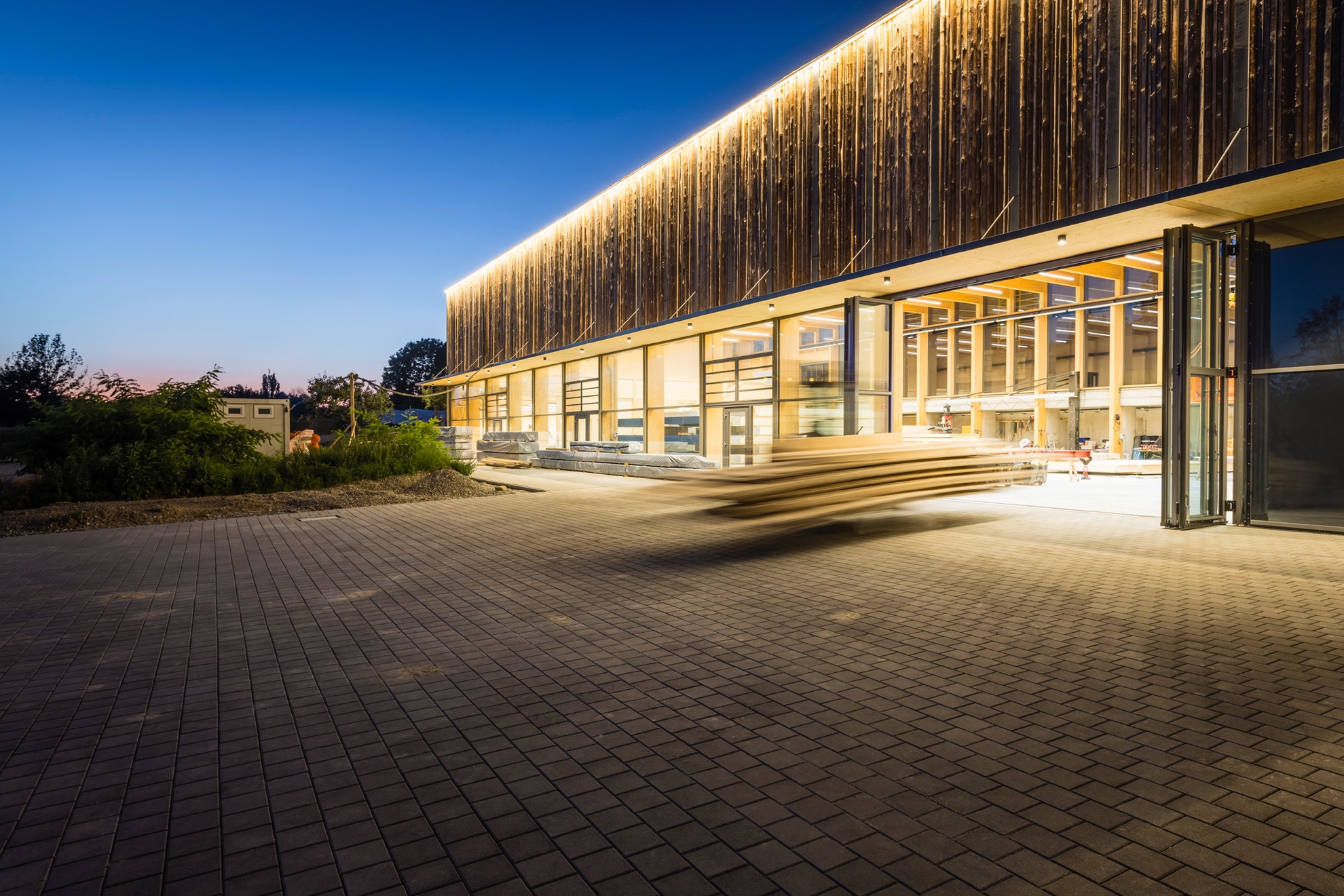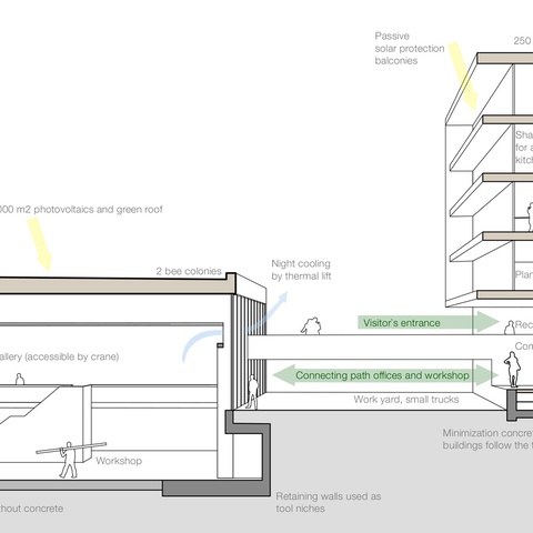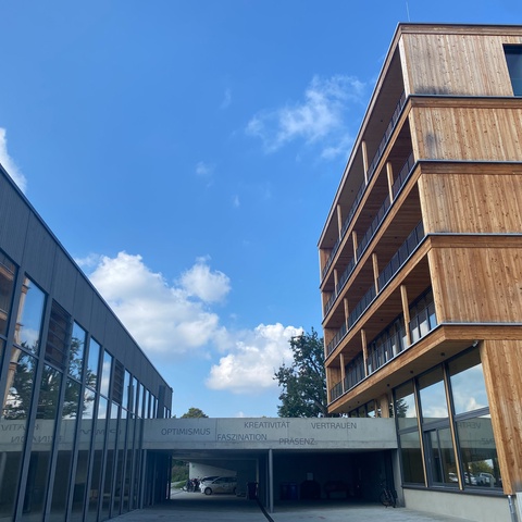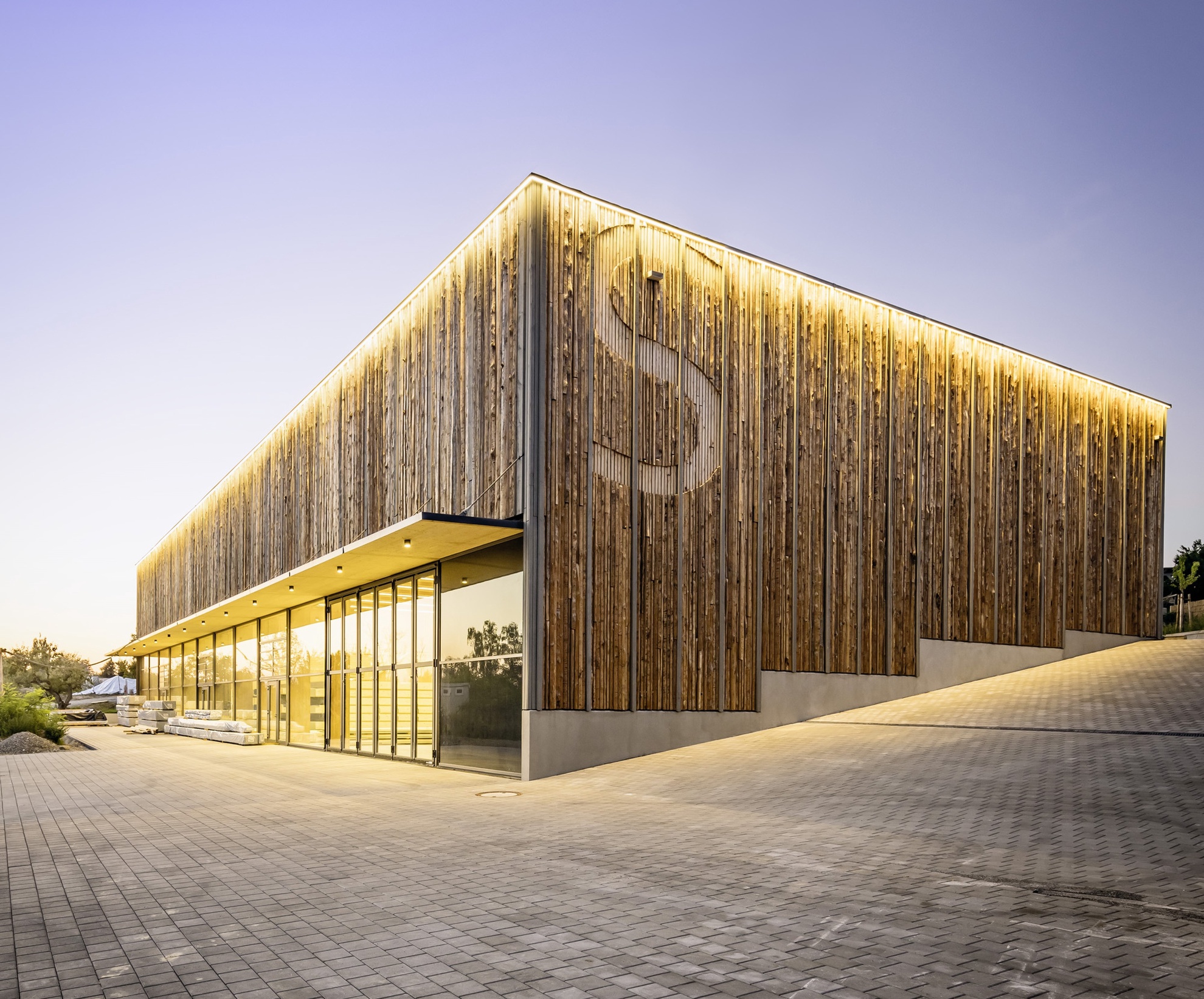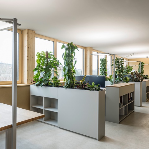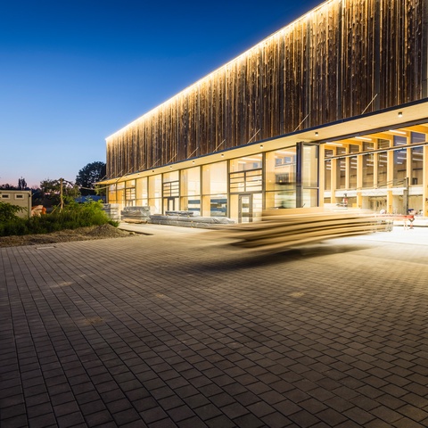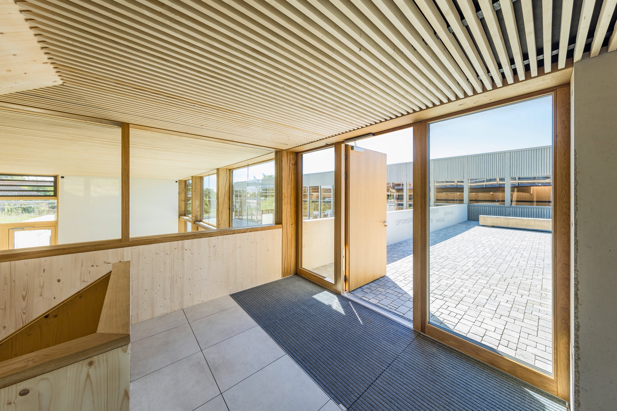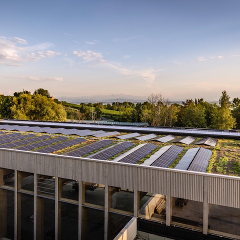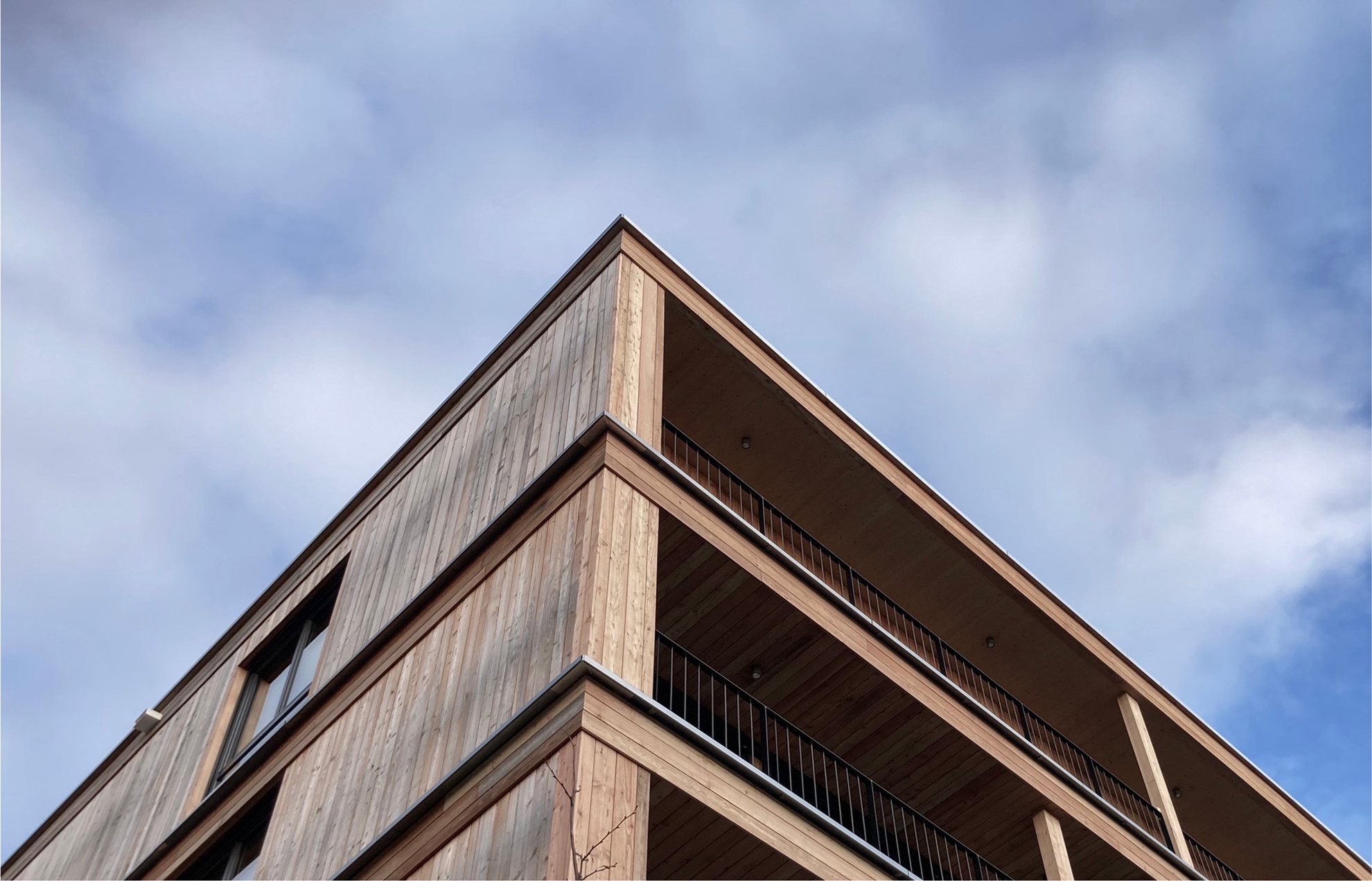 Der Holzbaubetrieb Schmäh verlegte seinen Standort vom Meersburger Zentrum in ein Gewerbegebiet. Dort errichtete er ein KfW-40-Plus-Ensemble in Holzskelettbauweise, bestehend aus einer Produktionshalle und einem sechsgeschossigem Verwaltungs- und Wohngebäude mit zehn Mitarbeiterwohnungen. Im Fokus des Bauvorhabens standen effiziente und robuste Holzbauprozesse, Ressourcenschonung sowie kreislauffähige Konstruktionen ohne Verbundstoffe. Die Neubauten nutzen daher flexibel ausbaubare Tragwerke, regionale Holzarten und recycelte bzw. Abfallmaterialien, mehrfach verwendbare Bauteile nach dem Cradle-to-Cradle-Prinzip sowie vorgefertigte Bauteile. Mechanische Verbindungen ermöglichen einen sortenreinen Rückbau. Die hangangepasste Anordnung der Gebäude reduzierte den Einsatz von Stahlbeton und ermöglichte funktionale Erschließungsebenen. Bautechnik und Baustoffe erfüllen maximale Energieeffizienzstandards und ermöglichen ein – über 50 Jahre berechnet – klima-positives Gebäude. Zur Senkung des Jahresprimärenergiebedarfs werden weitestgehend erneuerbare Energien wie eine Hackschnitzelheizung, eine Wärmepumpe und eine Photovoltaikanlage eingesetzt. Zahlreiche prozessorientierte Vorteile ergaben sich aus der engen Zusammenarbeit zwischen Architekturbüro und Holzbauunternehmen, der Bauphasen-Logistik sowie der lokalen Material- und Bauteilproduktion, z.B. mit Lehm aus der Baugrube.