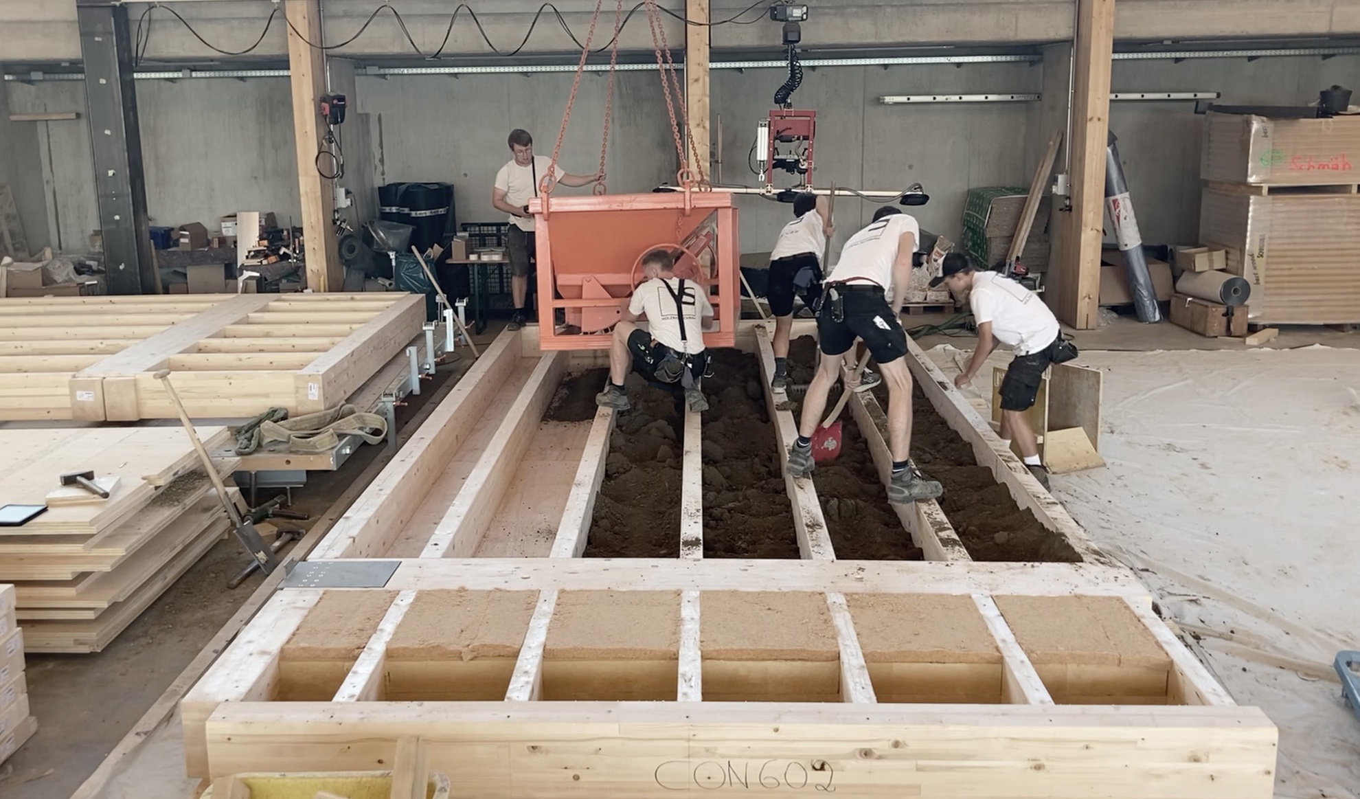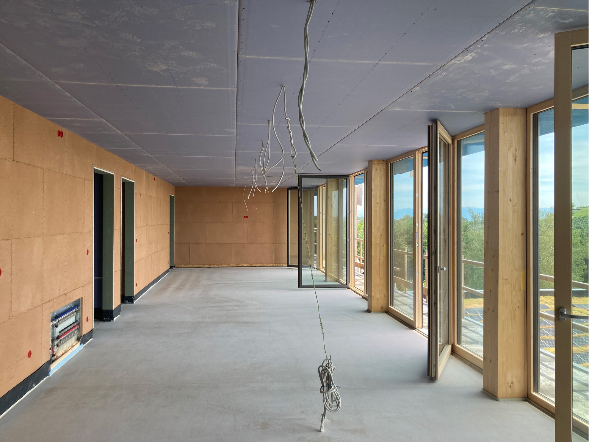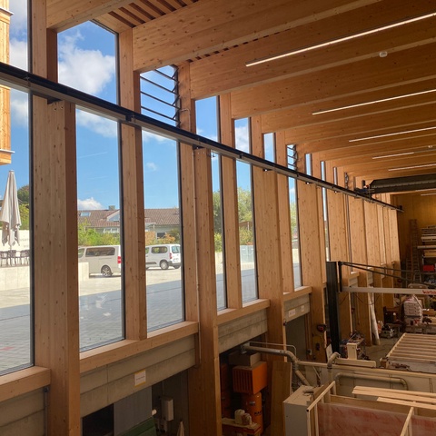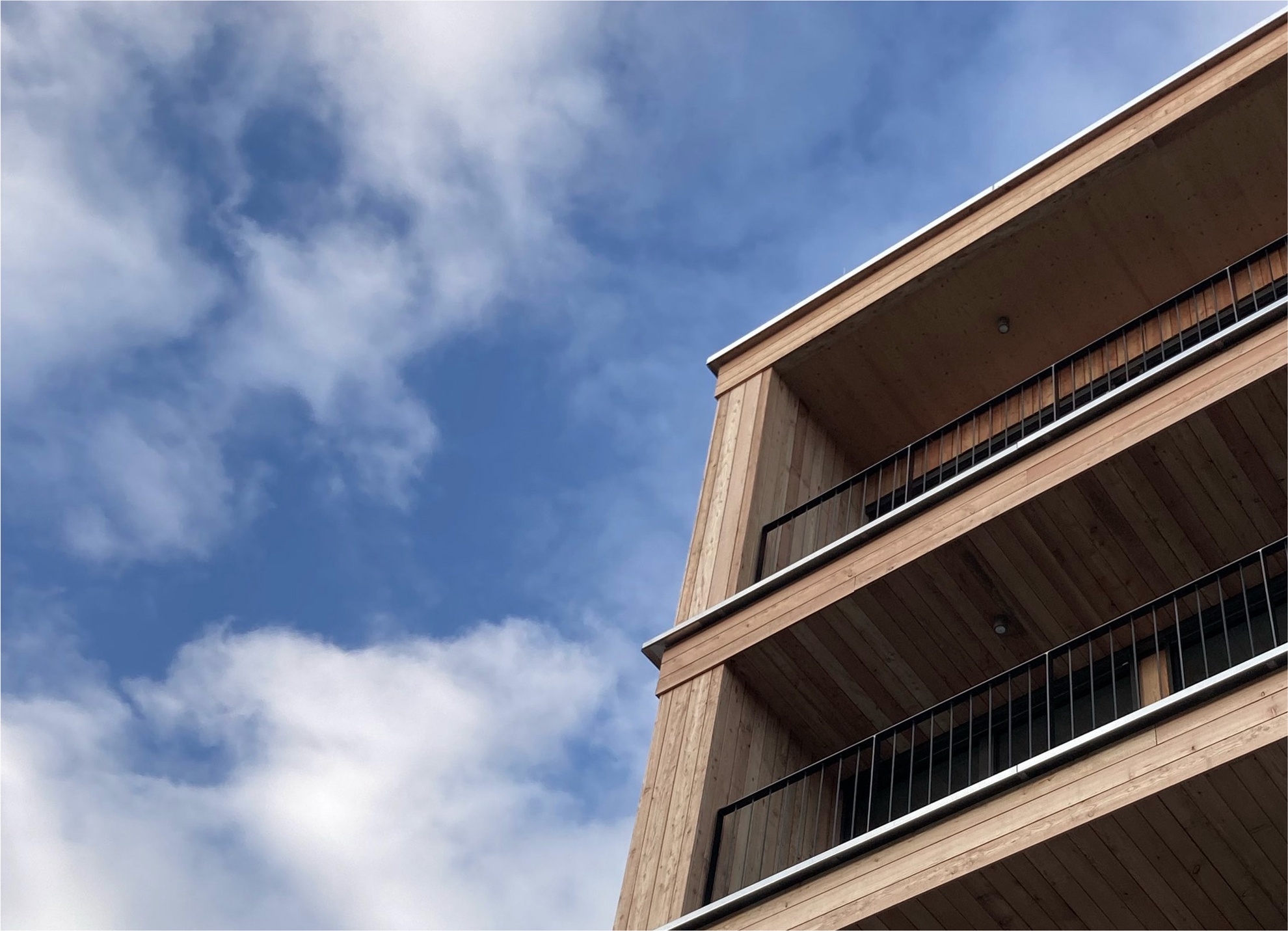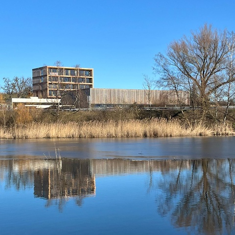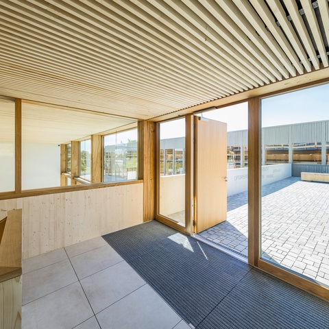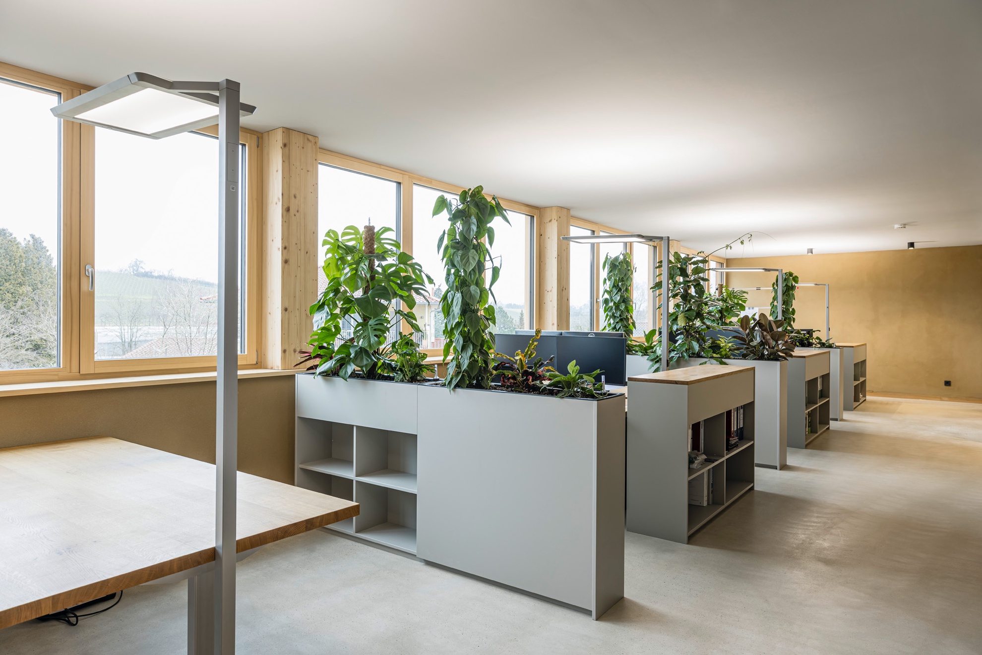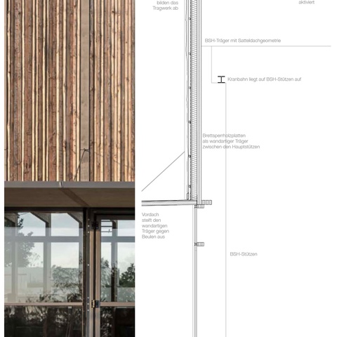 Der Holzbaubetrieb Schmäh verlegte seinen Standort vom Meersburger Zentrum in ein Gewerbegebiet. Dort errichtete er ein KfW-40-Plus-Ensemble in Holzskelettbauweise, bestehend aus einer Produktionshalle und einem sechsgeschossigem Verwaltungs- und Wohngebäude mit zehn Mitarbeiterwohnungen. Im Fokus des Bauvorhabens standen effiziente und robuste Holzbauprozesse, Ressourcenschonung sowie kreislauffähige Konstruktionen ohne Verbundstoffe. Die Neubauten nutzen daher flexibel ausbaubare Tragwerke, regionale Holzarten und recycelte bzw. Abfallmaterialien, mehrfach verwendbare Bauteile nach dem Cradle-to-Cradle-Prinzip sowie vorgefertigte Bauteile. Mechanische Verbindungen ermöglichen einen sortenreinen Rückbau. Die hangangepasste Anordnung der Gebäude reduzierte den Einsatz von Stahlbeton und ermöglichte funktionale Erschließungsebenen. Bautechnik und Baustoffe erfüllen maximale Energieeffizienzstandards und ermöglichen ein – über 50 Jahre berechnet – klima-positives Gebäude. Zur Senkung des Jahresprimärenergiebedarfs werden weitestgehend erneuerbare Energien wie eine Hackschnitzelheizung, eine Wärmepumpe und eine Photovoltaikanlage eingesetzt. Zahlreiche prozessorientierte Vorteile ergaben sich aus der engen Zusammenarbeit zwischen Architekturbüro und Holzbauunternehmen, der Bauphasen-Logistik sowie der lokalen Material- und Bauteilproduktion, z.B. mit Lehm aus der Baugrube.