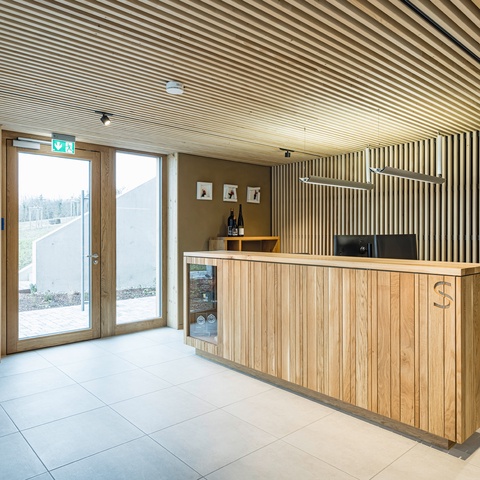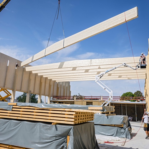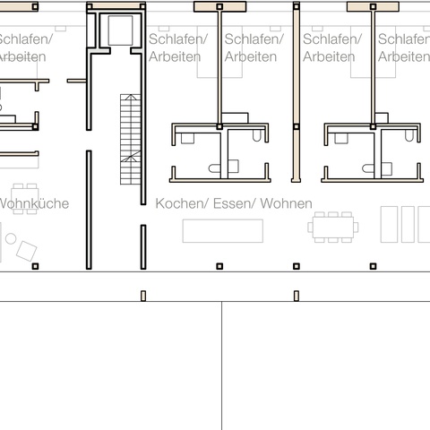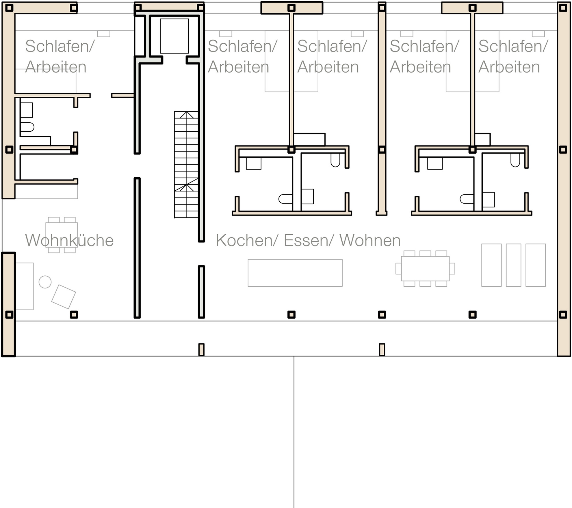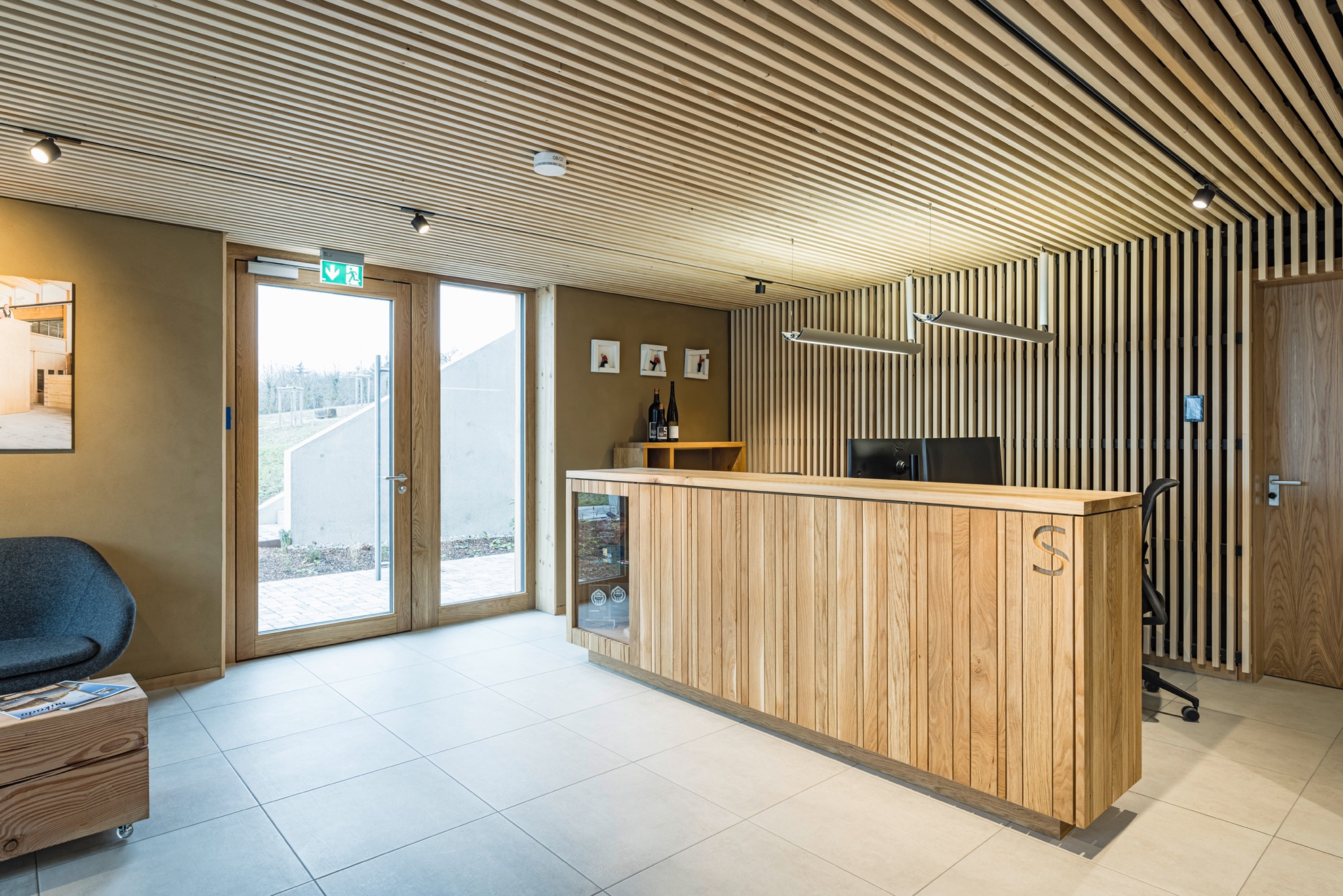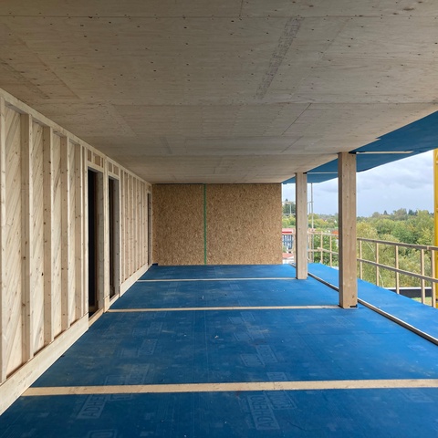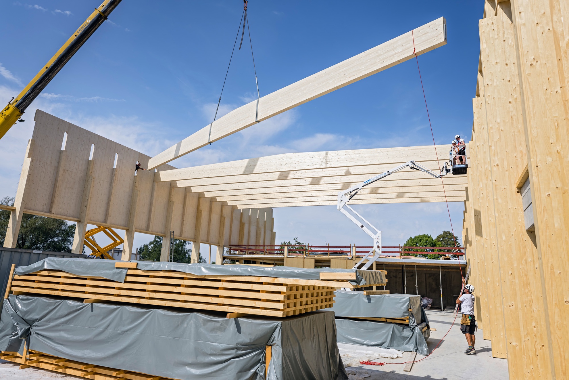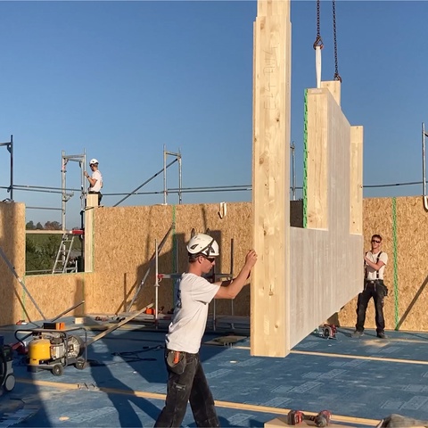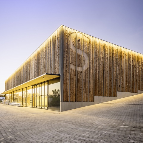 Der Holzbaubetrieb Schmäh verlegte seinen Standort vom Meersburger Zentrum in ein Gewerbegebiet. Dort errichtete er ein KfW-40-Plus-Ensemble in Holzskelettbauweise, bestehend aus einer Produktionshalle und einem sechsgeschossigem Verwaltungs- und Wohngebäude mit zehn Mitarbeiterwohnungen. Im Fokus des Bauvorhabens standen effiziente und robuste Holzbauprozesse, Ressourcenschonung sowie kreislauffähige Konstruktionen ohne Verbundstoffe. Die Neubauten nutzen daher flexibel ausbaubare Tragwerke, regionale Holzarten und recycelte bzw. Abfallmaterialien, mehrfach verwendbare Bauteile nach dem Cradle-to-Cradle-Prinzip sowie vorgefertigte Bauteile. Mechanische Verbindungen ermöglichen einen sortenreinen Rückbau. Die hangangepasste Anordnung der Gebäude reduzierte den Einsatz von Stahlbeton und ermöglichte funktionale Erschließungsebenen. Bautechnik und Baustoffe erfüllen maximale Energieeffizienzstandards und ermöglichen ein – über 50 Jahre berechnet – klima-positives Gebäude. Zur Senkung des Jahresprimärenergiebedarfs werden weitestgehend erneuerbare Energien wie eine Hackschnitzelheizung, eine Wärmepumpe und eine Photovoltaikanlage eingesetzt. Zahlreiche prozessorientierte Vorteile ergaben sich aus der engen Zusammenarbeit zwischen Architekturbüro und Holzbauunternehmen, der Bauphasen-Logistik sowie der lokalen Material- und Bauteilproduktion, z.B. mit Lehm aus der Baugrube.